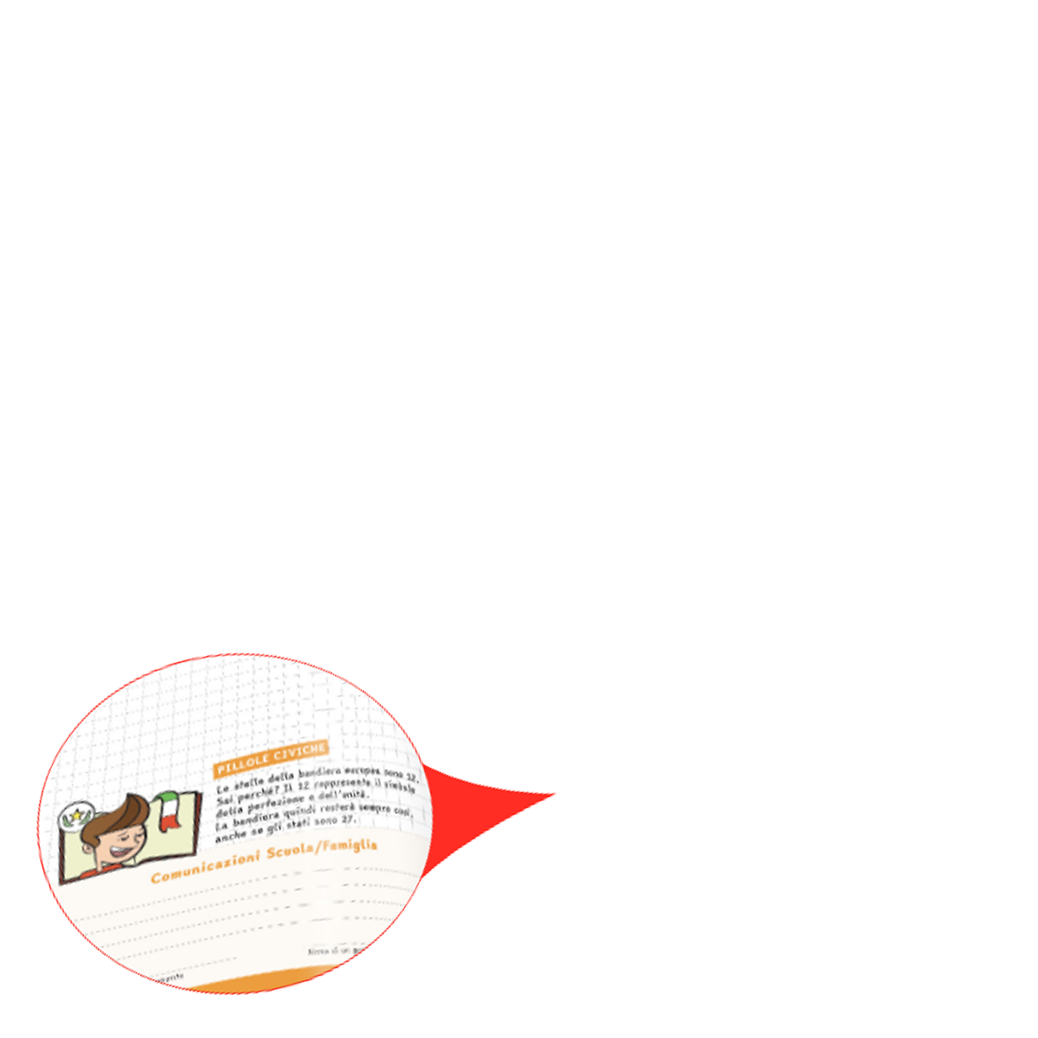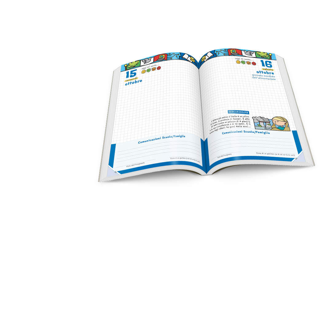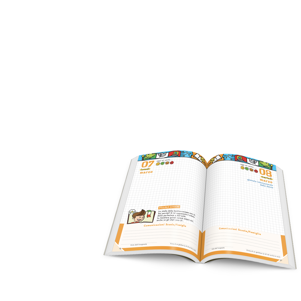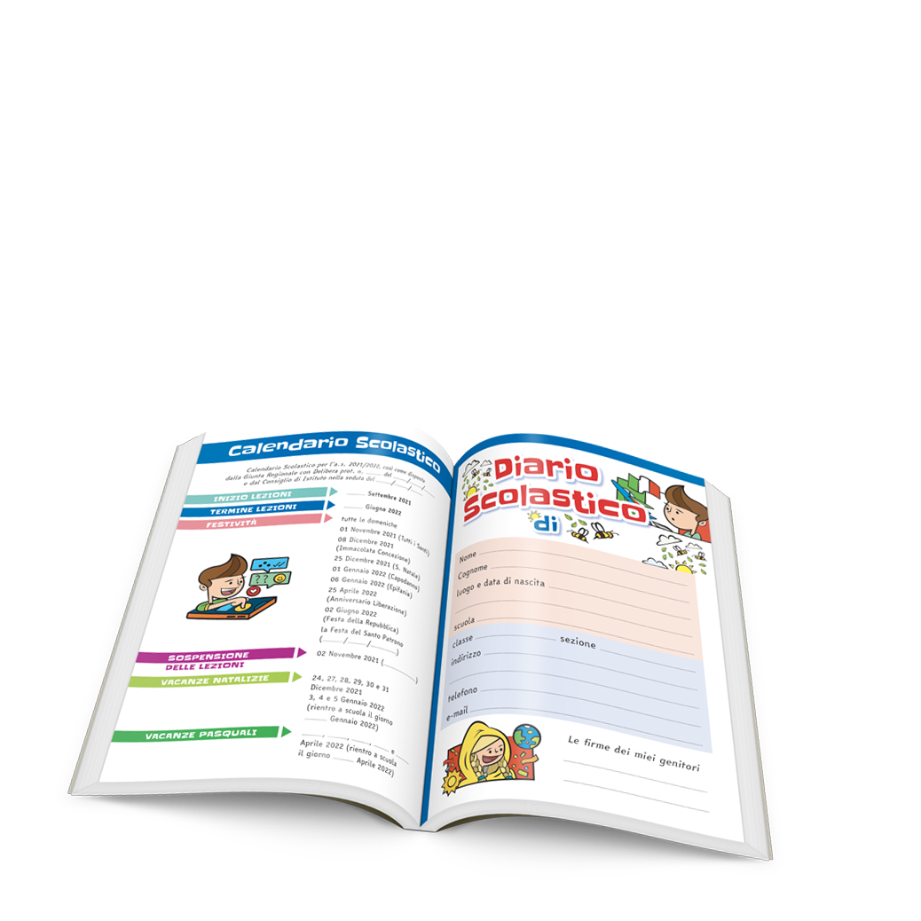 Le pagine del Diario, stampate in quadricromia e arricchite da contenuti editoriali (illustrazioni, curiosità, rompicapo e barzellette), riportano una sezione dedicata alla comunicazione scuola-famiglia per consentire a docenti e genitori di avere un filo diretto ogni giorno.
