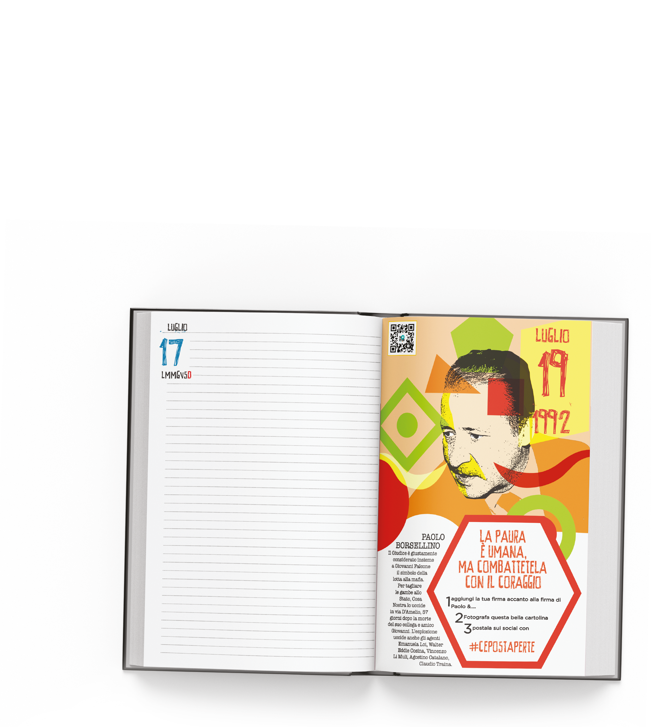 La copertina cartonata plastificata opaca è disponibile in due colori simbolo della lotta alla mafia, rosso e nero. Ed è proprio la battaglia quotidiana contro l’ingiustizia della malavita che – già dalla copertina – Illegal vuole celebrare: protagonisti della cover sono proprio i due volti simbolo della legalità italiana, Falcone e Borsellino, nell’anno in cui ricorre il trentesimo anniversario della loro scomparsa. Illegal, però, non è solo questo: è e deve essere anche un valido supporto per la scrittura e la didattica. Per questo PaperFIRST e Gruppo Spaggiari offrono al mondo della scuola un prodotto assolutamente innovativo che mescola le caratteristiche dell’agenda scolastica con quella nuova specie di prodotti editoriali che invitano il lettore a interagire con il libro stesso, proponendo informazioni, riflessioni e azioni coerenti con il focus del prodotto.