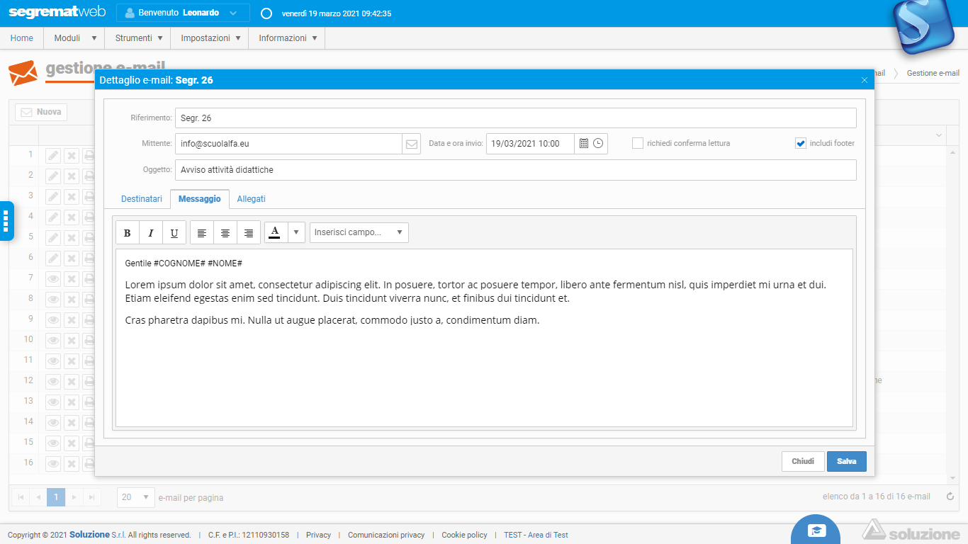 Permette di inviare comunicazioni massive o singole direttamente da SegrematWeb, utilizzando gli indirizzi e-mail associati agli utenti alunni, genitori e docenti.
